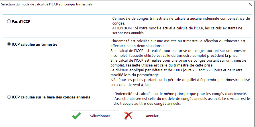 Ce premier choix "Pas d'ICCP" est la valeur par défaut si le module n'a jamais été activé. Il permet dans le cas contraire de désactiver tout calcul d'ICCP pour le modèle de congés trimestriels concerné.