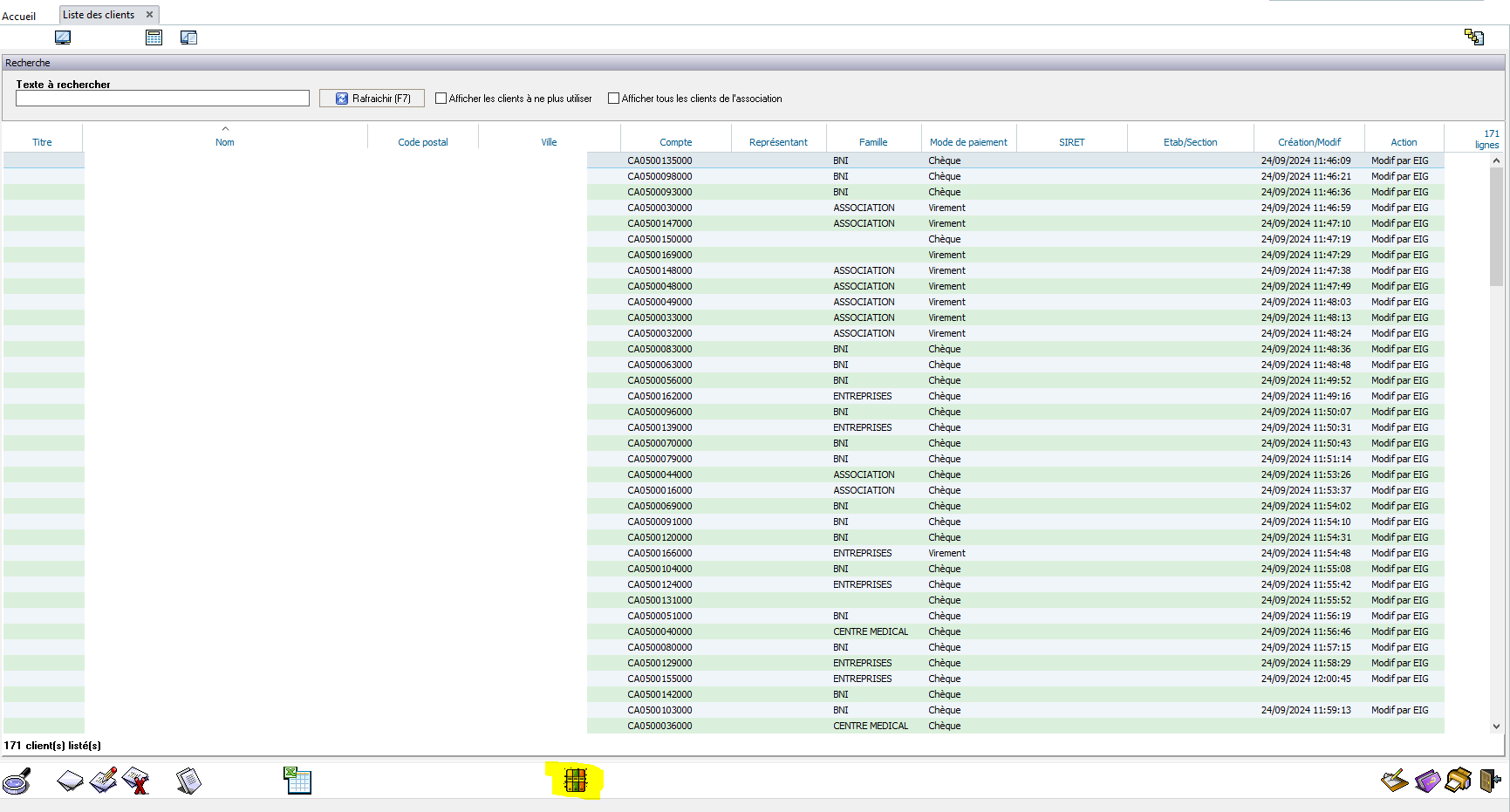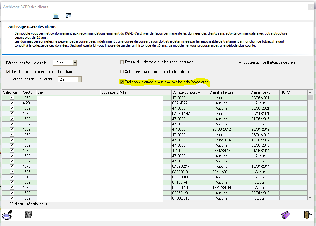 - D'effectuer le traitement sur tous les clients de l'association. A confirmer auprès de tous les intervenants de la facturation ou du responsable de la facturation ou de la sécurité des données au sein de l'association