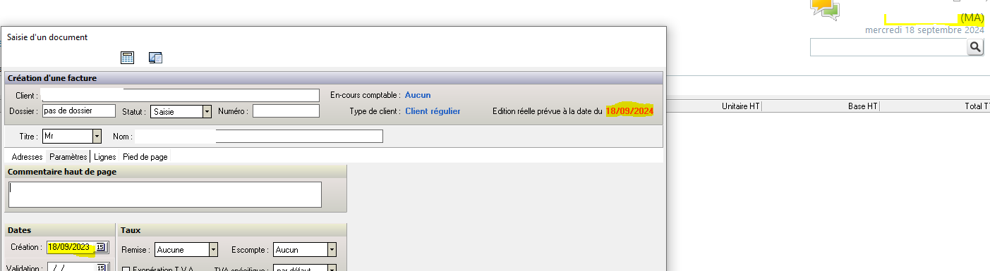 Les utilisateurs ont la possibilité de créer une facture sur une plage de dates précises. En dehors de cette plage de dates, cela leur est interdit. Dans l'exemple présenté, nous antidatons la facture d'un an :