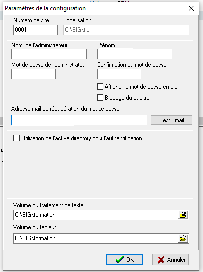 - Il y a déjà une personne de référencée en tant qu’administrateur, dans ce cas-là, il est possible de renseigner un deuxième administrateur en rajoutant dans la fenêtre paramètres de la configuration, au niveau du champ « Adresse mail de récupération du mot de passe », une deuxième adresse mail en séparant par un ; voire plusieurs adresses mails toutes spéarées par un ; mais attention : la totalité de la saisie ne doit pas dépasser 128 caractères.