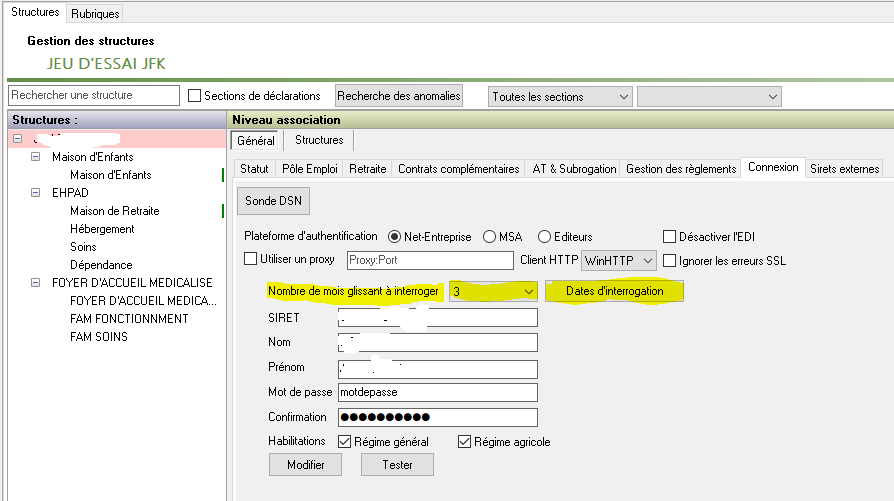 Il se situe dans le paramétrage DSN, au niveau association (SIREN) et dans l'onglet Connexion (Menu DSN). Il est indiqué par une ligne supplémentaire :