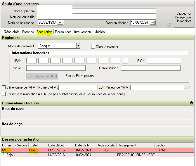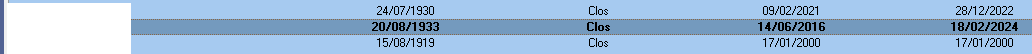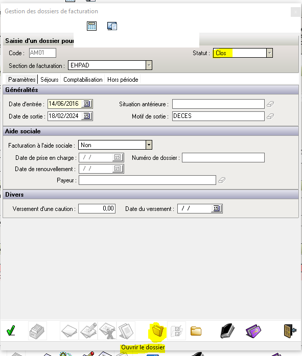 - Sélectionner la ligne du dossier. Le numéro de dossier est constitué des initiales de la personne (Nom et Prénom puis d'un numéro, par défaut 01. Dans le cas présent AM01. dans la zone "Statut", la mention "Clos" est renseignée