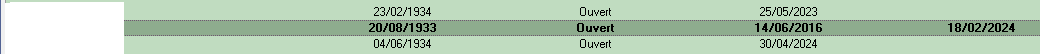 - Sélectionner la personne concernée dans la liste. Les personnes sorties sont présentées sur un fond bleu. La personne sélectionnée est surlignée en bleu et la police est graissée. Dans l'exemple ci-dessous, nous sélectionnons Marthe AMBERIEUX