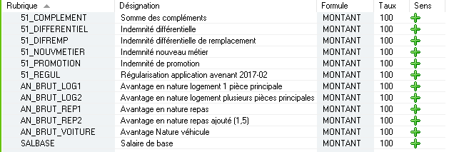 - 51_ANNULSALMIN : Rubrique annulant le salaire remplacé par le minimum conventionnel. La rubrique BRUT est une somme de rubriques de paye comprenant entre autres SALBASE, 51_DIFFERENTIEL, 51_REMP, 51_PROMOTION, etc, et également 51_MINCONV. Dans le cas où 51_MINCONV est égal à 1450€, les premières rubriques doivent être neutralisées, sinon le brut est erroné. C’est le rôle de la rubrique 51_ANNULSALMIN.