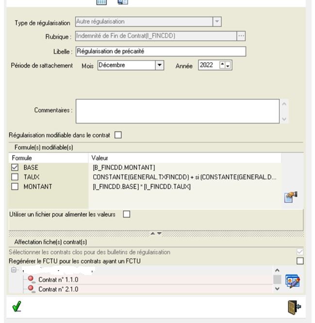 En procédant comme précédemment pour effectuer la régularisation des contrats clos, il faut programme la régularisation de la précarité comme suit :