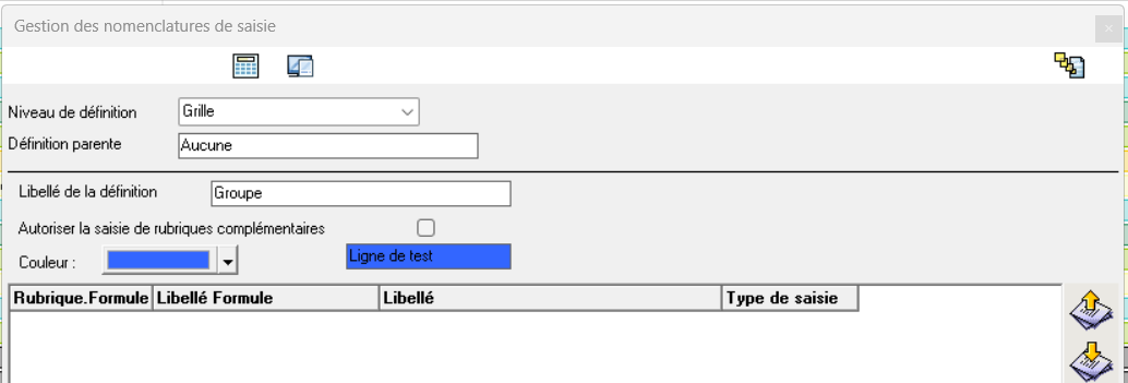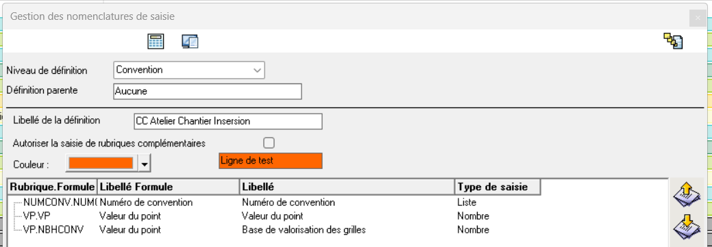 Dans Autres paramètres / Définitions de saisies il faut créer la nomenclature de la façon suivante :