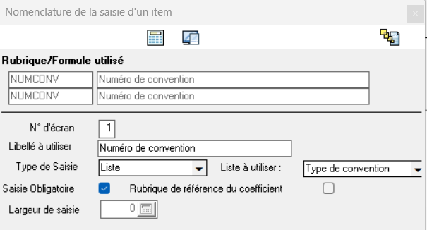 Bien cocher la case Saisie obligatoire, cela permet d'initialiser automatiquement la rubrique libre NUMCONV.NUMCONV qui contient le numéro de convention qui est utilisée pour la création de rubriques spécifiques.