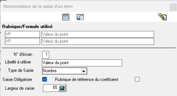 - Bien cocher la case Saisie obligatoire, cela permet d'initialiser automatiquement la rubrique libre VP.VP qui contient la valeur du point.