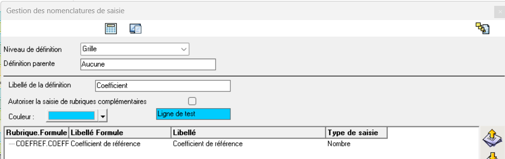 - Ajouter une ligne de type grille avec un seul item, le coefficient de référence (rubrique COEFREF.COEFREF)