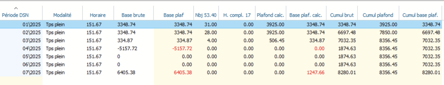 Dans cet exemple, une anomalie est détectée sur avril 2025. Néanmoins toutes les périodes depuis le début d'année sont affichées afin de permettre une vision d'ensemble des éléments de calcul. On remarque que la cause de l'anomalie est la base brute qui est négative. Dans ce cas, l'Urssaf prend zéro pour le recalcul du plafond.