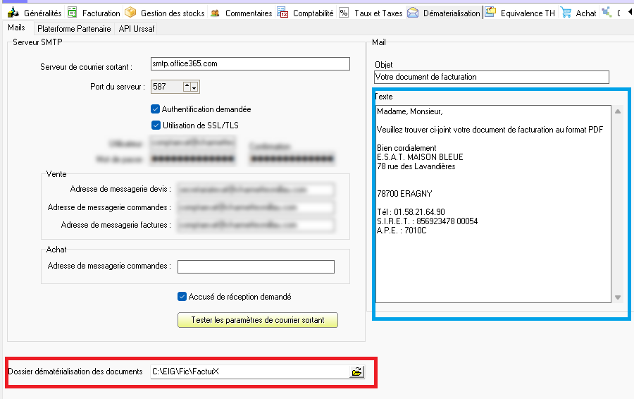 Dans la gestion des structures, au niveau de l'onglet dématérialisation, vous devez renseigner le dossier récepteur des documents qui vont être générés au format Factur-X (zone entourée en rouge dans la copie d'écran)