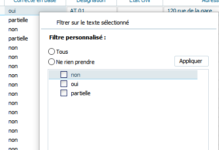 La colonne Correcte en base reprend les valeurs de validité pour chaque adresse Oui, Non, Partielle