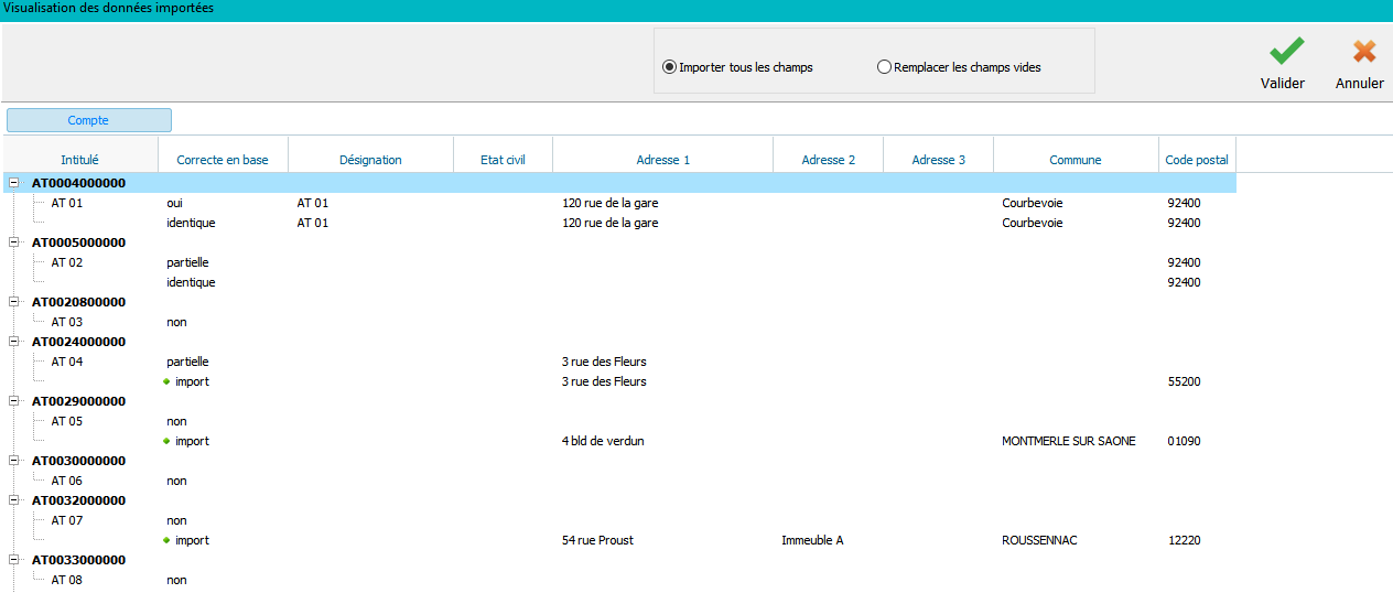 Pour les autres comptes présents dans la liste à importer l'écran affiche la comparaison des valeurs d'adresse