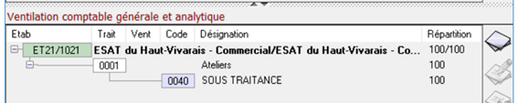 Dans l’onglet comptabilisation des fiches contrats, il est possible d’affecter des traitements et codes ou ventilations analytiques dans la répartition comptable, notamment pour les travailleurs handicapés d’ESAT ou les salariés d’Entreprise Adaptée :