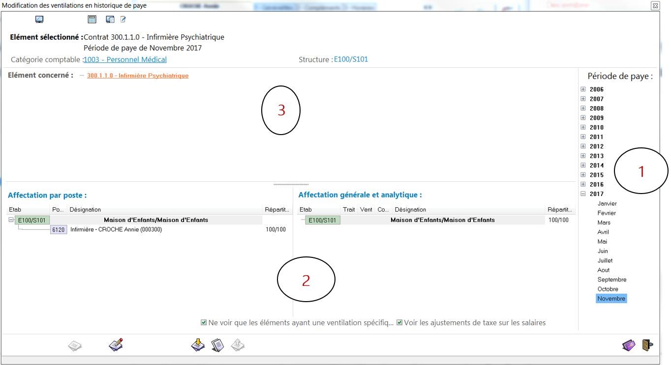 Sont affichés, ici, les éléments de paye ayant une ventilation différenciée qui déroge à la ventilation du contrat. Ils est possible de visualiser tous les éléments en décochant la case « Ne voir que les éléments ayant ubne ventilation spécifique ».