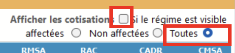 Si vous ne trouvez pas la cotisation, c'est qu'elle existe déjà dans le gestionnaire de régime mais qu'elle n'est affectée à aucun régime. Dans ce cas, décochez la case Afficher les cotisations et cochez Toutes