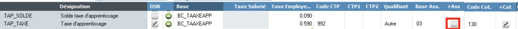 Attention à ne pas cocher la case de la colonne +Ass. Il ne faut pas envoyer la base en DSN car elle est déjà envoyée par la cotisation Maladie