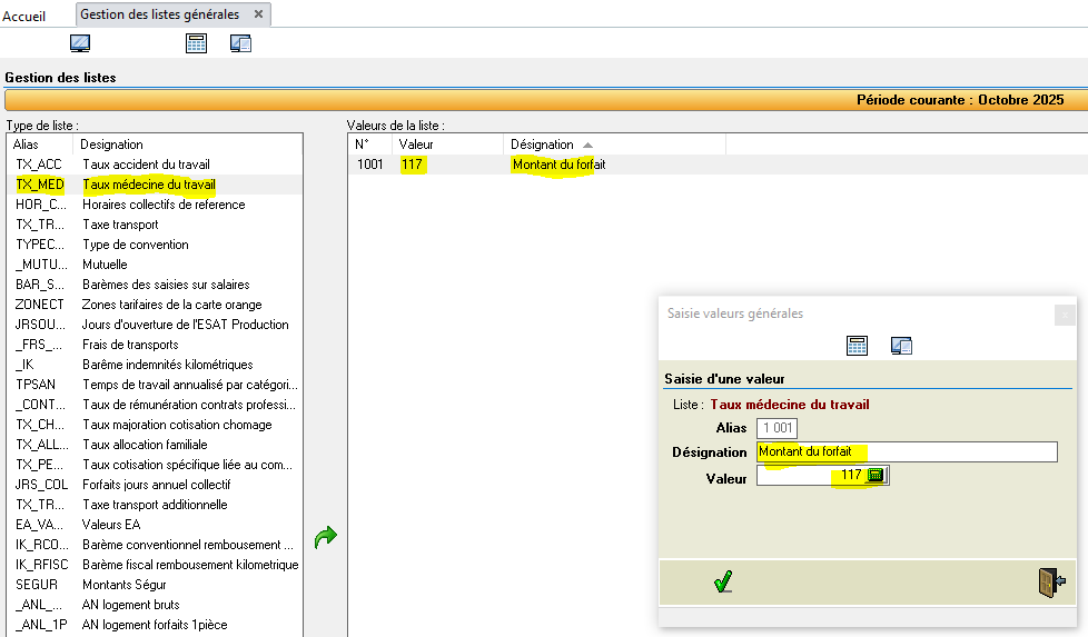 Alors (application du forfait codifié sur la première ligne (1001) de la liste générale taux de médecine du travail (TX_MED))