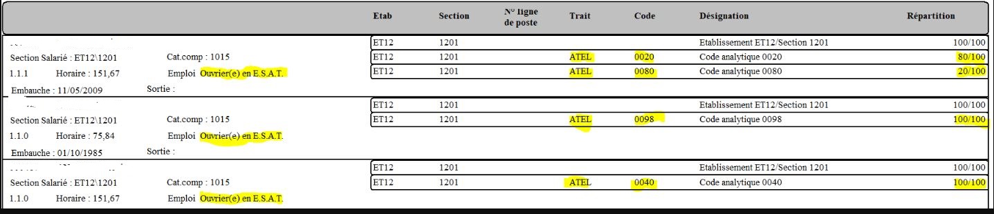 Dans l’onglet "Comptabilisation" des fiches contrats, il est possible d’affecter des traitements et codes ou ventilations analytiques dans la répartition comptable, notamment pour les travailleurs handicapés d’ESAT ou les salariés d’Entreprise Adaptée :