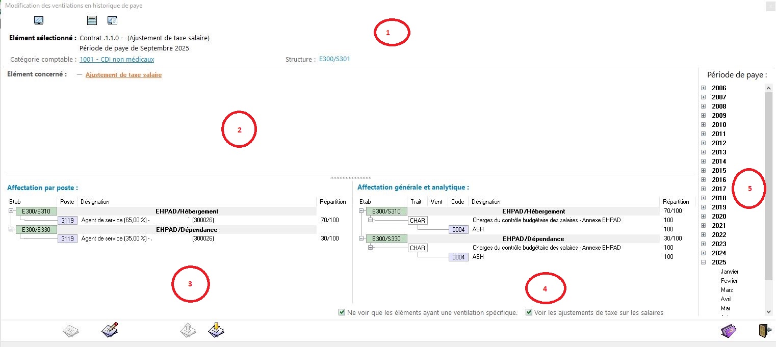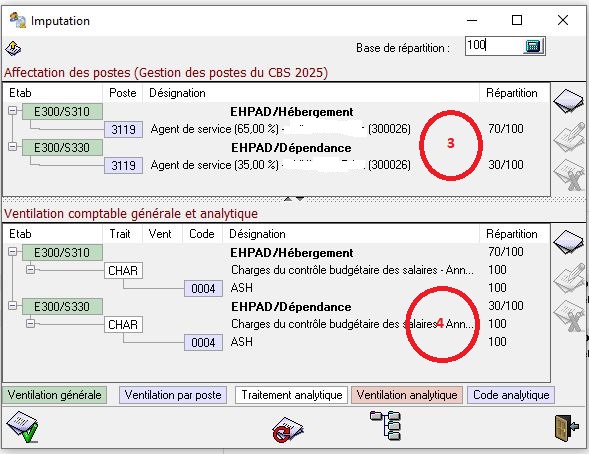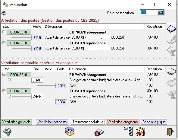 - Cette partie concerne les rubriques ayant une ventilation spécifique affectée lors de la saisie de la variable et qui déroge à la ventilation du salarié
