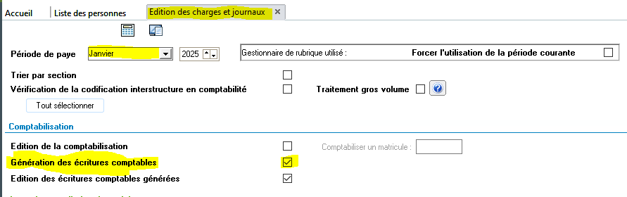 Il faut utiliser le menu Traitements pour lancer la génération des écritures comptables des mois concernés par les charges et journaux.