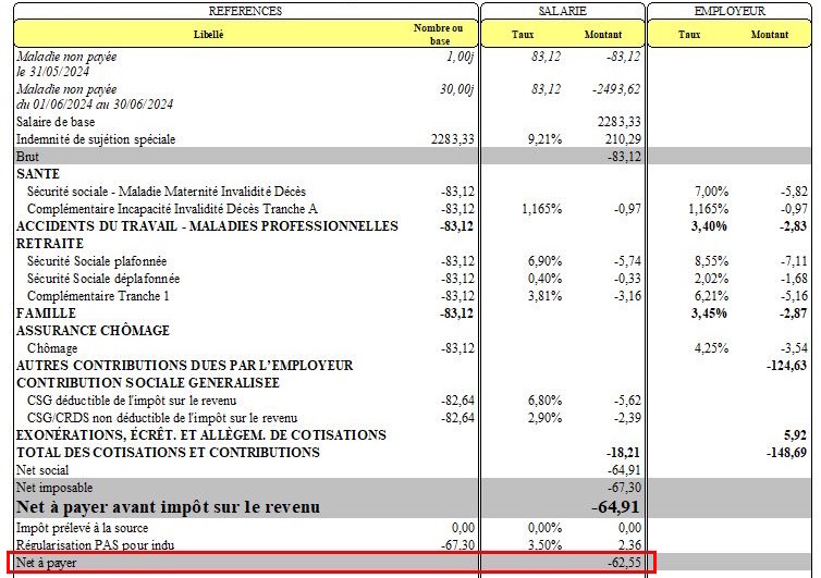 Net à payer de 1876,40 € - Trop perçu antérieur de 62,55 € = Net à payer de 1813,85 €
