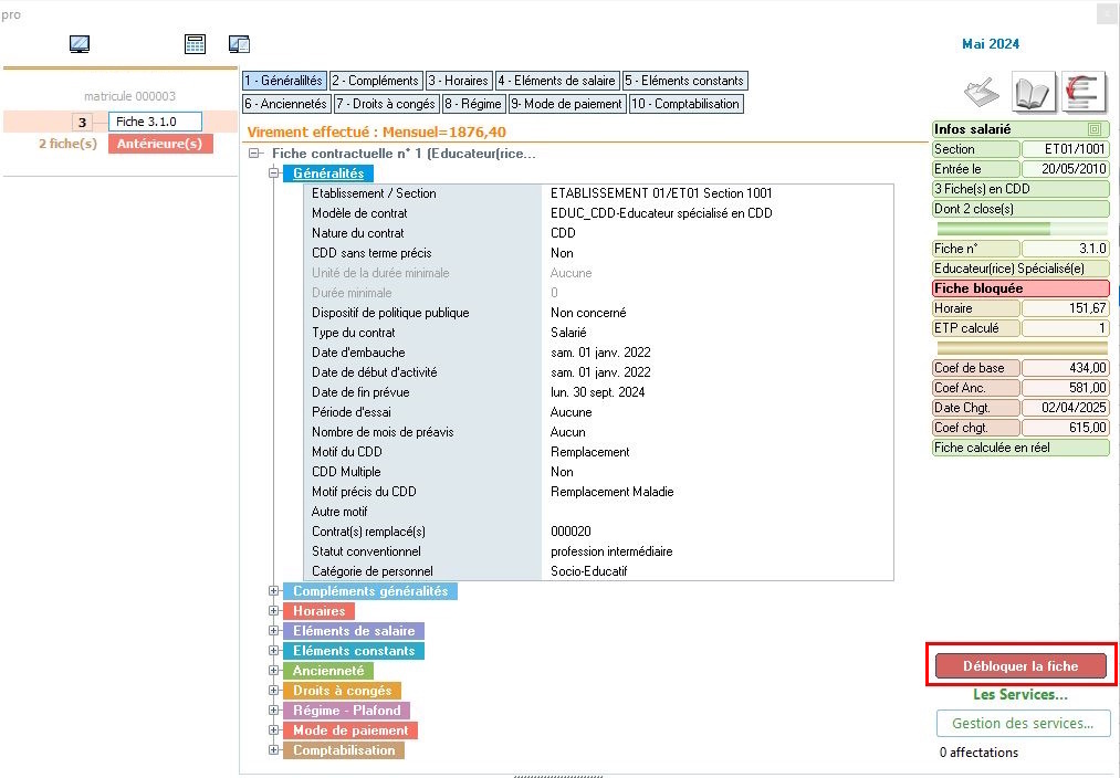 5) Débloquer la fiche pour pouvoir saisir une variable de paye