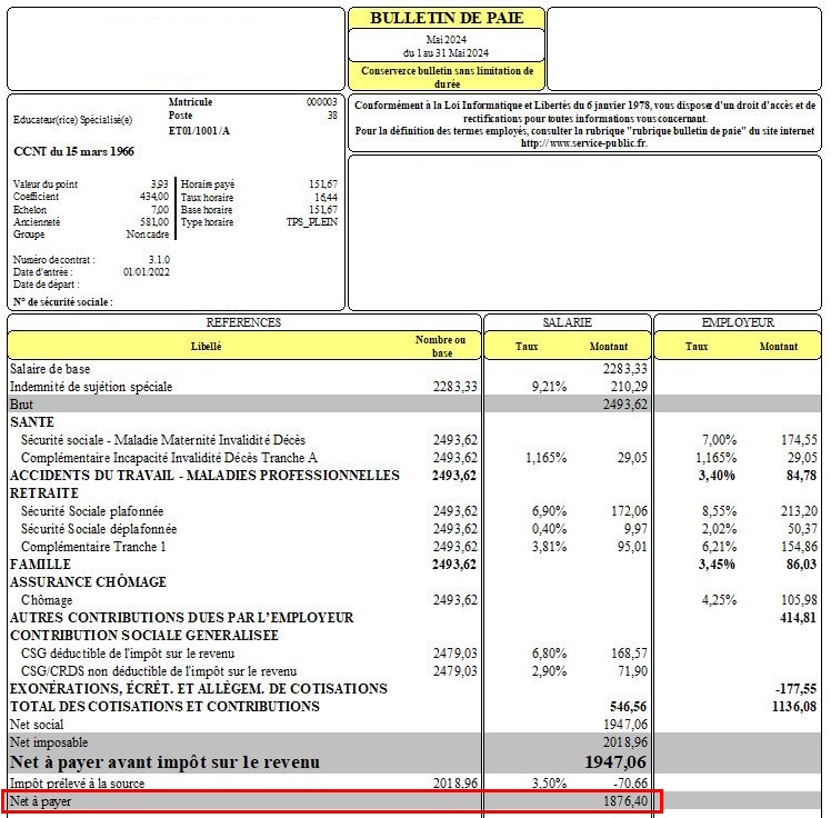 Ici, exemple d'un bulletin de paye de Mai 2024 avec un net à payer de 1876,40 €
