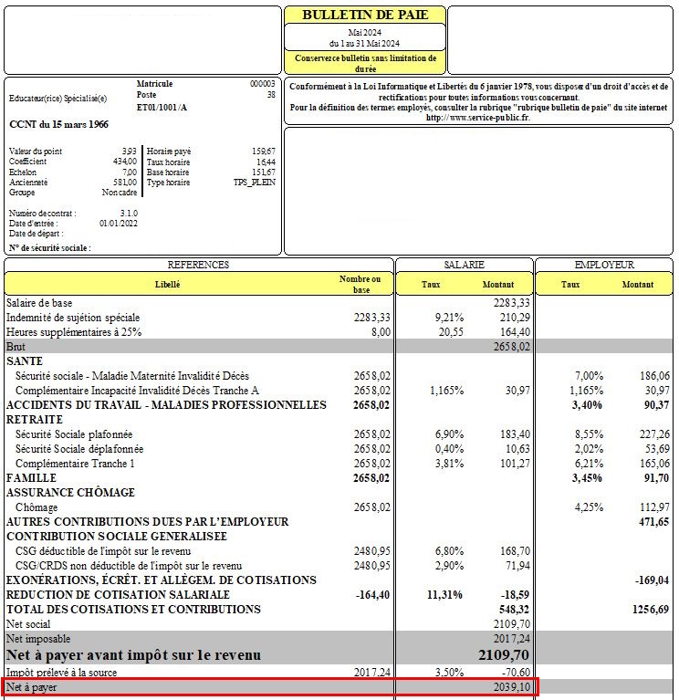 Ici dans l'exemple, bulletin de paye de Mai 2024 Version 2, avec les 8 heures supplémentaires en + et un net à payer de 2039,10 €