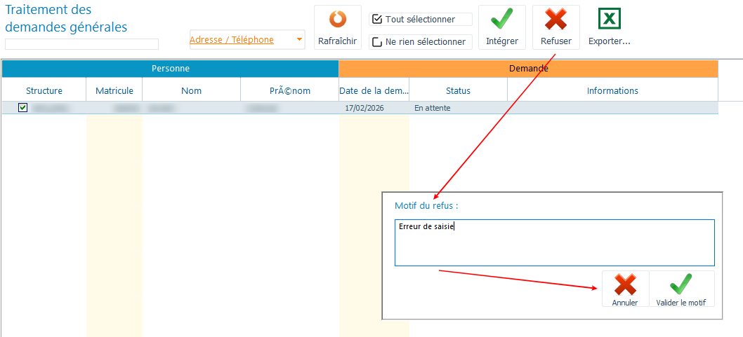 Si vous désirez refuser une ou plusieurs demandes, il vous faut sélectionner ces dernières et cliquer sur le bouton "Refuser".