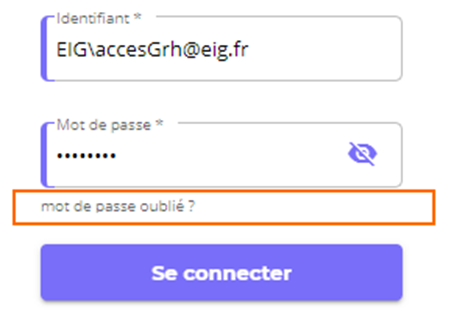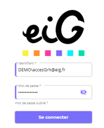 Votre compte utilisateur sera composé d'un préfixe suivi de votre adresse mail (par exemple DEMO\accesGrh@eig.fr).