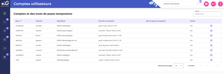 Si le salarié ne reçoit pas de nouveau mail avec ses identifiants, les utilisateurs administrateurs ont la possibilité de forcer la réinitialisation du mot de passe, ainsi que le renvoi du mail dans la gestion des comptes utilisateurs (roue crantée).
