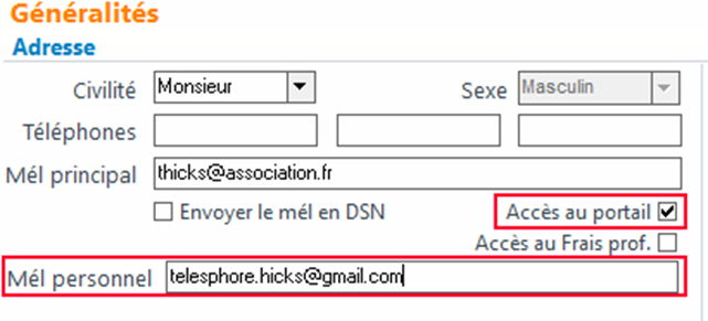 - Ajouter l'accès au portail dans la fiche personne : Pour qu'un salarié ait accès au portail Ma RH, il faut lui donner l'accès dans sa fiche personne en cochant la case "Accès au portail". Il faut également s'assurer que le salarié ait transmis une adresse mail personnelle si cette dernière doit être utilisée pour la connexion et la renseigner dans sa fiche personne, sans quoi il ne pourra pas recevoir d'identifiants de connexion.