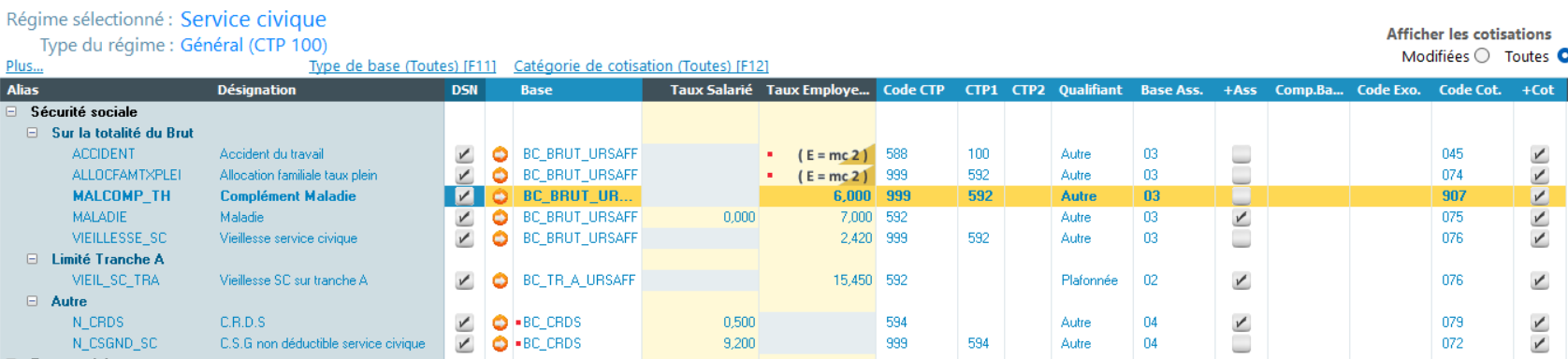 - VIEILLESSE_SC : Vieillesse service civique Taux = 2.42% CTP = 592 Déplafonné (03)