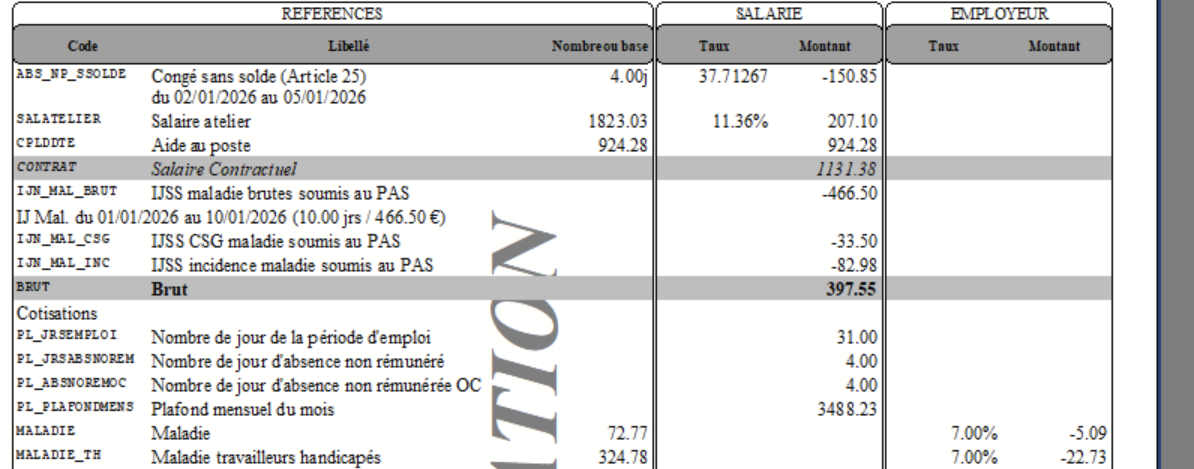 En revanche si on ajoute une absence non payée, celle ci est bien déduite. Ici, la rémunération envoyée en DSN sera de